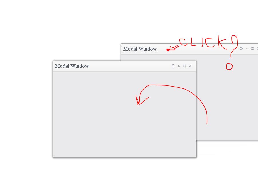 el.kendoWindow({ click: function(){ alert('go'); // Please do something like this ... }, width: "500px", height: "300px", dragend: function(){ this.toFront(); // So bad, right? }, actions: ["Refresh", "Minimize", "Maximize", "Close"], title: "Modal Window", }).data("kendoWindow").center().open();