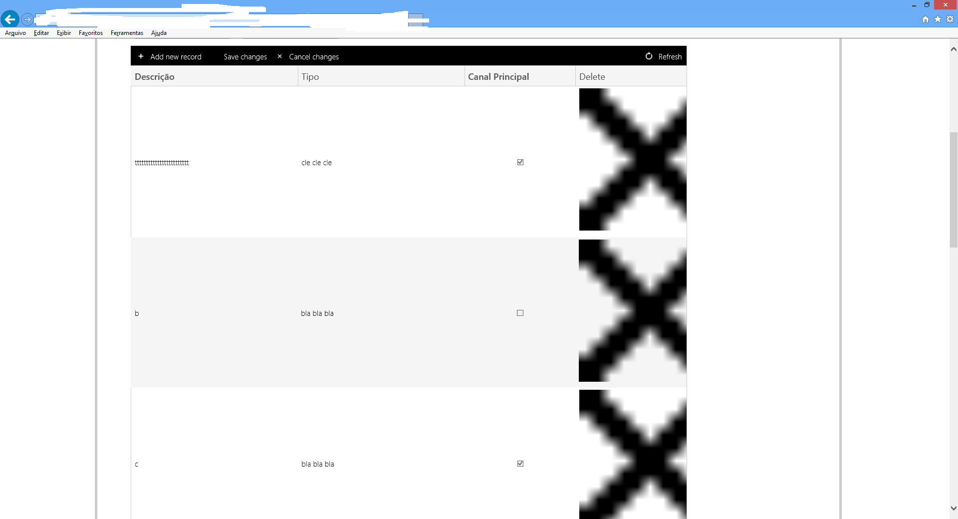 <telerik:RadGrid ID="grdCanaisComunicacao" runat="server" AllowSorting="true" AutoGenerateColumns="false" Width="80%" OnNeedDataSource="grdCanaisComunicacao_NeedDataSource" OnBatchEditCommand="grdCanaisComunicacao_BatchEditCommand"> <MasterTableView DataKeyNames="CanalComunicacaoID" EditMode="Batch" BatchEditingSettings-OpenEditingEvent="DblClick" CommandItemDisplay="Top"> <Columns> <telerik:GridBoundColumn DataField="Descricao" UniqueName="colDescricao" HeaderText="Descrição" HeaderStyle-Width="30%"> </telerik:GridBoundColumn> <telerik:GridTemplateColumn DataField="CanalComunicacaoTipoID" UniqueName="colTipo" HeaderText="Tipo" HeaderStyle-Width="30%"> <ItemTemplate> <asp:Label runat="server" ID="lblTipo" Text='<%# Eval("TipoDescricao") %>'></asp:Label> </ItemTemplate> <EditItemTemplate> <telerik:RadDropDownList runat="server" ID="ddlTipoCanal" DataValueField="CanalComunicacaoTipoID" DataTextField="Descricao" DataSourceID="dsCanalComunicacaoTipo"> </telerik:RadDropDownList> </EditItemTemplate> </telerik:GridTemplateColumn> <telerik:GridCheckBoxColumn DataField="IsPrincipal" HeaderText="Canal Principal" SortExpression="IsPrincipal" UniqueName="colIsPrincipal" ItemStyle-HorizontalAlign="Center" HeaderStyle-Width="20%"> </telerik:GridCheckBoxColumn> <telerik:GridButtonColumn ConfirmText="Excluir este canal de comunicação?" ConfirmDialogType="RadWindow" HeaderStyle-Width="20%" ConfirmTitle="Delete" HeaderText="Delete" ButtonType="ImageButton" ItemStyle-Width="16px" ItemStyle-Height="16px" CommandName="Delete" Text="Delete" UniqueName="DeleteColumn"> </telerik:GridButtonColumn> </Columns> </MasterTableView> </telerik:RadGrid>