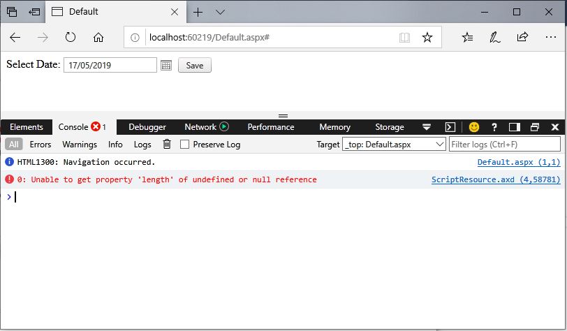 <%@ Page Language="C#" AutoEventWireup="true" CodeBehind="Default.aspx.cs" Inherits="EdgeDatePickerIssue.Default" %><!DOCTYPE html><html xmlns="http://www.w3.org/1999/xhtml"><head runat="server"> <title>Default</title></head><body> <form id="form1" runat="server"> <asp:ScriptManager ID="ScriptManager" runat="server" ScriptMode="Release" /> <asp:UpdatePanel runat="server" ID="upPanel"> <ContentTemplate> <label>Select Date:</label> <telerik:RadDatePicker ID="dpStartDate" runat="server" MaxDate="2020-01-01" MinDate="2000-01-01" AutoPostBack="true" OnSelectedDateChanged="dpStartDate_SelectedDateChanged" /> <telerik:RadButton ID="btnSave" runat="server" Text="Save" OnClick="btnSave_Click" /> </ContentTemplate> </asp:UpdatePanel> </form></body></html>