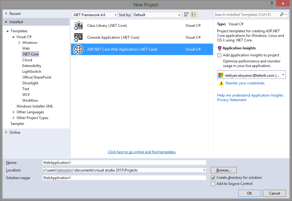 If that does not fix your problem, try creating ASP.NET Core Web Application (.NET Core) project (check new-project-wizard.png attachment for reference) and then create Telerik ASP.NET Core MVC Application project.