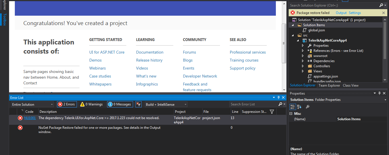 I created a new project using the Telerik ASP.NET Core MVC Application template. After the solution is created there is an error saying the dependency is missing.
