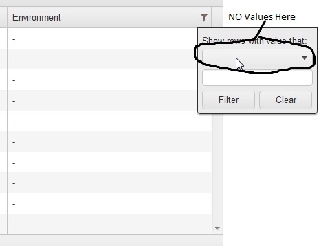 When I click filter button no values appear as you can see in the attached doc...