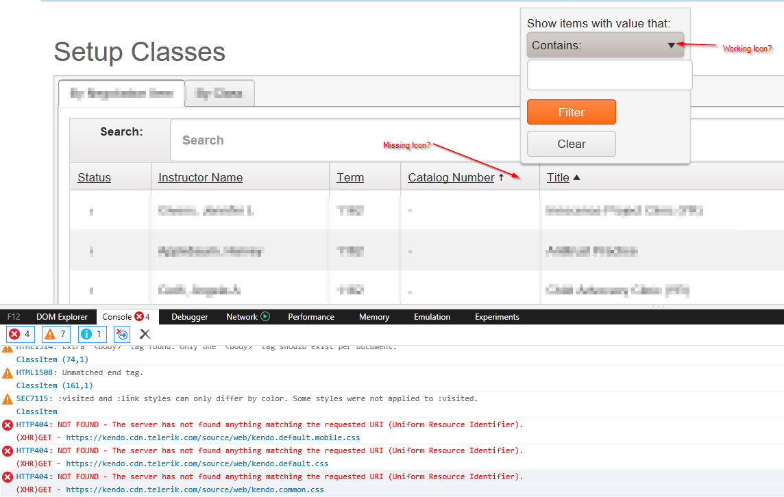I switched my asp.net + kendoui website to use the Kendo CDN and now I am missing the (some?) icons from the grid. I am getting the errors below that appear to be coming from the redirects on kendo's side.