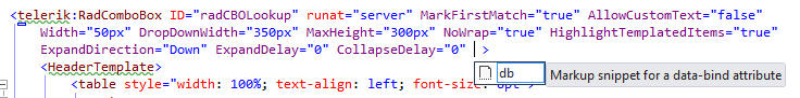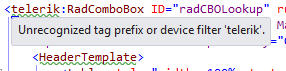 I just updated my VS2012 to update 4 and my Telerik controls to v.2013.3.114.35. I also have JustCode v2013.3.1119.1 installed. Since then, my aspx intellisense no longer works for the telerik controls and I also get an "unrecognized tag prefix or device filter 'telerik'" message on each telerik control (tag.jpg). I have my telerik controls registered in my web.config file instead of on each aspx page (there are 300+ pages). I can see the controls in design view, the project compiles and runs okay. I do get intellisense for the asp controls (aspx) and for both asp and telerik in the code behind (vb). I have uninstalled the telerik controls and reinstalled, all to no avail. I have disabled/enabled JustCode. When I am inside a telerik control (aspx) and hit the space bar (intellisense should kick in here) all I get is a ( "db" Markup snippet for a data-bind attribute ) (snippet.jpg) in place of the intellisense.