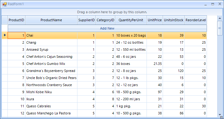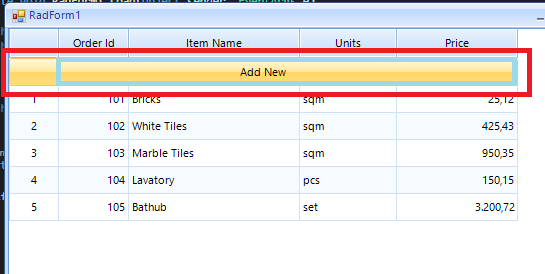 internal class CustomGridNewRowElement : GridRowElement{ private GridCellElement cellElement; private RadButtonElement radButtonElement; public RadButtonElement AddButtton => this.radButtonElement; public CustomGridNewRowElement() { } protected override void CreateChildElements() { base.CreateChildElements(); this.cellElement = new GridCellElement(null, this) { StretchHorizontally = true, StretchVertically = true }; this.radButtonElement = new RadButtonElement("Add New"); this.Children.Add(cellElement); this.cellElement.Children.Add(this.radButtonElement); this.cellElement.ClipDrawing = true; } public override bool IsCompatible(GridViewRowInfo data, object context) { return data is CustomGridViewRowInfo; }}internal class CustomGridViewRowInfo : GridViewNewRowInfo{ public CustomGridViewRowInfo(GridViewInfo viewInfo) : base(viewInfo) { } public override Type RowElementType => typeof(CustomGridNewRowElement);}the problem is im missing an rowheadercellelement as shown on attachment, i need the Add Button only fit on GridViewDataColumns like a standard GridViewNewRowInfo,