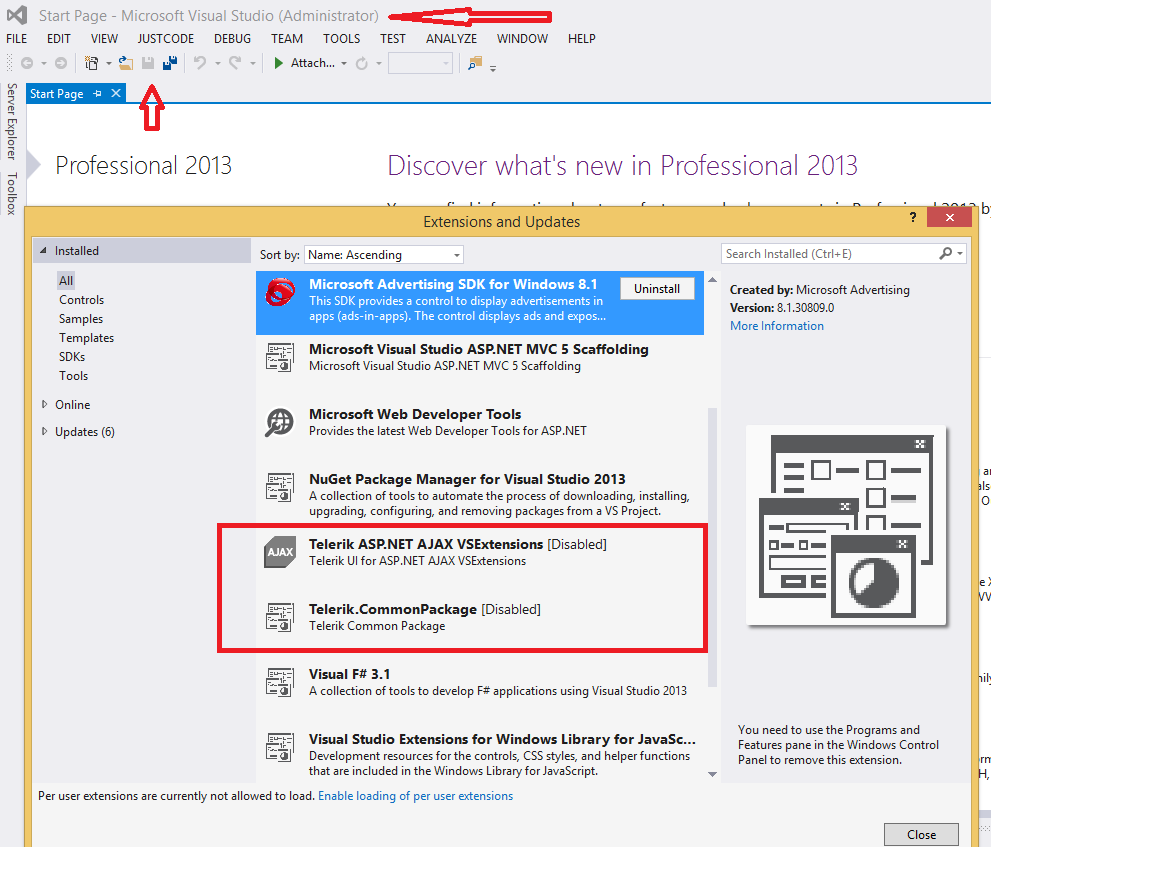 - Search for "Telerik ASP.NET AJAX VSExtensions" in the Search Visual Studio Gallery box to the right.