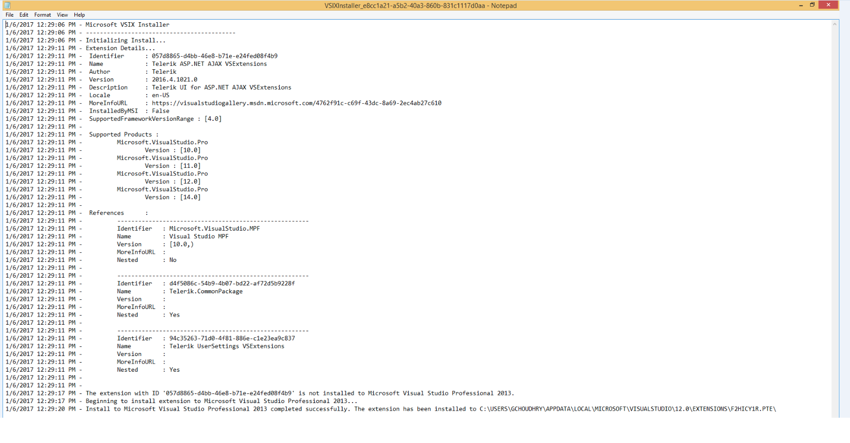Attach I am sending latest VsixInstaller log file. Also I noticed each time I open my project, Telerik Report Upgrade Wizard comes up. Very Strange.