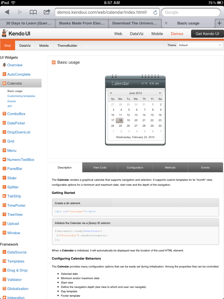 1. On both my iPad2 and my Android HTC EVO, when clicking on days within the calendar a "#" is appended to the URL. This causes issues when used with a Kendo UI Mobile application.