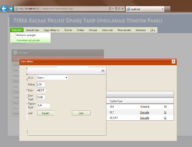 <%@ Page Title="" Language="VB" MasterPageFile="~/Site.master" CodePage="1254" AutoEventWireup="false" CodeFile="Satinalmalar.aspx.vb" Inherits="Satinalmalar" %><%@ Register Assembly="Telerik.Web.UI" Namespace="Telerik.Web.UI" TagPrefix="telerik" %><asp:Content ID="Content1" ContentPlaceHolderID="HeadContent" runat="Server"> <style type="text/css"> .style1 { width: 100%; } .style2 { width: 29px; } .style3 { } .style4 { width: 155px; } .style5 { width: 256px; } </style></asp:Content><asp:Content ID="Content2" ContentPlaceHolderID="MainContent" runat="Server"> <h2> Products </h2> <br /> <telerik:RadWindowManager ID="RadWindowManager1" runat="server" Skin="Sunset"> </telerik:RadWindowManager> <telerik:RadGrid ID="RadGrid1" runat="server" AutoGenerateColumns="False" CellSpacing="0" DataSourceID="SqlDataSource_Faturalar" GridLines="None" AllowAutomaticDeletes="True" AllowAutomaticInserts="True" AllowAutomaticUpdates="True" Width="469px" Skin="Sunset"> <MasterTableView DataKeyNames="ID, Guidid" DataSourceID="SqlDataSource_Faturalar" CommandItemDisplay="Top" EditMode="PopUp"> <CommandItemSettings ExportToPdfText="Export to PDF" AddNewRecordText="Yeni kayıt" ShowRefreshButton="False"></CommandItemSettings> <RowIndicatorColumn FilterControlAltText="Filter RowIndicator column"> <HeaderStyle Width="20px"></HeaderStyle> </RowIndicatorColumn> <ExpandCollapseColumn FilterControlAltText="Filter ExpandColumn column"> <HeaderStyle Width="20px"></HeaderStyle> </ExpandCollapseColumn> <Columns> <telerik:GridBoundColumn DataField="ID" DataType="System.Int32" FilterControlAltText="Filter ID column" HeaderText="ID" ReadOnly="True" Visible="false" SortExpression="ID" UniqueName="ID"> </telerik:GridBoundColumn> <telerik:GridBoundColumn DataField="FirmaAdi" FilterControlAltText="Filter FirmaAdi column" HeaderText="FirmaAdi" SortExpression="FirmaAdi" UniqueName="FirmaAdi"> </telerik:GridBoundColumn> <telerik:GridBoundColumn DataField="FaturaNo" FilterControlAltText="Filter FaturaNo column" HeaderText="FaturaNo" SortExpression="FaturaNo" UniqueName="FaturaNo"> </telerik:GridBoundColumn> <telerik:GridBoundColumn DataField="Tarih" FilterControlAltText="Filter Tarih column" HeaderText="Tarih" SortExpression="Tarih" UniqueName="Tarih"> </telerik:GridBoundColumn> <telerik:GridEditCommandColumn CancelText="İptal" EditText="Güncelle" FilterControlAltText="Filter EditCommandColumn column" InsertText="Ekle" UpdateText="Kaydet"> </telerik:GridEditCommandColumn> <telerik:GridButtonColumn CommandName="Delete" ConfirmText="Kaydı silmek istediğinize eminmisiniz ?" ConfirmTitle="KarinaMira" FilterControlAltText="Filter column column" UniqueName="column" ConfirmDialogType="RadWindow" Text="Sil"> </telerik:GridButtonColumn> </Columns> <EditFormSettings EditFormType="Template" InsertCaption="Yeni Kayıt" CaptionFormatString="Güncelleme"> <EditColumn FilterControlAltText="Filter EditCommandColumn column"> </EditColumn> <FormTemplate> <table class="style1"> <tr> <td class="style2"> </td> <td class="style3"> Firma Adı </td> <td> <telerik:RadComboBox ID="RadComboBox1" runat="server" DataSourceID="SqlDataSource_Firmalar" DataTextField="FirmaAdi" DataValueField="Guidid" EmptyMessage="Seçiniz" Skin="Outlook" OnDataBound="RadComboBox1_DataBound" SelectedValue='<%# Bind("FirmaGuidid") %>'> </telerik:RadComboBox> <asp:RequiredFieldValidator ID="RequiredFieldValidator1" runat="server" ControlToValidate="RadComboBox1" ErrorMessage="**" Font-Bold="True" Font-Size="Small" ForeColor="#CC3300"></asp:RequiredFieldValidator> </td> <td> </td> </tr> <tr> <td class="style2"> </td> <td class="style3"> Fatura No </td> <td> <asp:TextBox ID="TextBox2" runat="server" Text='<%# Bind("FaturaNo") %>'></asp:TextBox> <asp:RequiredFieldValidator ID="RequiredFieldValidator5" runat="server" ControlToValidate="TextBox2" ErrorMessage="**" Font-Bold="True" Font-Size="Small" ForeColor="#CC3300"></asp:RequiredFieldValidator> </td> <td> </td> </tr> <tr> <td class="style2"> </td> <td class="style3"> Tarih </td> <td> <asp:TextBox ID="TextBox3" runat="server" Text='<%# Bind("Tarih") %>'></asp:TextBox> </td> <td> </td> </tr> <tr> <td class="style2"> </td> <td class="style3"> </td> <td> </td> <td> </td> </tr> <tr> <td class="style2"> </td> <td class="style3" colspan="2"> detay<br /> <telerik:RadGrid ID="RadGrid2" runat="server" AllowAutomaticDeletes="True" OnNeedDataSource="RadGrid2_NeedDataSource" OnUpdateCommand="RadGrid2_UpdateCommand" OnInsertCommand="RadGrid2_InsertCommand" OnItemCommand="RadGrid2_ItemCommand" AutoGenerateColumns="False" DataKeyNames="No" OnDeleteCommand="RadGrid2_DeleteCommand" CellSpacing="0" GridLines="None"> <MasterTableView AutoGenerateColumns="False" CommandItemDisplay="Top" EditMode="PopUp" ShowHeadersWhenNoRecords="true"> <CommandItemSettings ExportToPdfText="Export to PDF" AddNewRecordText="Yeni fatura kalemi" ShowRefreshButton="False" /> <RowIndicatorColumn FilterControlAltText="Filter RowIndicator column"> </RowIndicatorColumn> <ExpandCollapseColumn FilterControlAltText="Filter ExpandColumn column"> </ExpandCollapseColumn> <Columns> <telerik:GridTemplateColumn DataField="No" DataType="System.Int32" FilterControlAltText="Filter No column" Visible="false" HeaderText="No" SortExpression="No" UniqueName="No"> <EditItemTemplate> <asp:TextBox ID="NoTextBox_" runat="server" Width="40px" Text='<%# Bind("No") %>'></asp:TextBox> </EditItemTemplate> <ItemTemplate> <asp:Label ID="NoLabel" runat="server" Text='<%# Eval("No") %>'></asp:Label> </ItemTemplate> </telerik:GridTemplateColumn> <telerik:GridTemplateColumn DataField="Urun" FilterControlAltText="Filter Urun column" HeaderText="Ürün" SortExpression="Urun" UniqueName="Urun"> <EditItemTemplate> <telerik:RadComboBox ID="RadComboBoxUrun_" runat="server" DataSourceID="SqlDataSource_Urunler" DataTextField="UrunAdi" DataValueField="Guidid" EmptyMessage="Seçiniz" Skin="Outlook" OnDataBound="RadComboBoxUrun_DataBound" SelectedValue='<%# Bind("UrunGuidid") %>'> </telerik:RadComboBox> <asp:RequiredFie