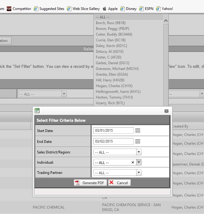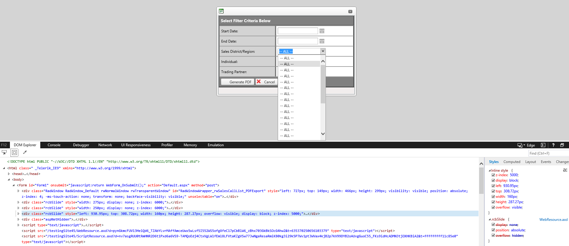 <telerik:RadWindowManager ID="rwmSalesCallList" runat="server" Style="z-index: 3"><Windows> <telerik:RadWindow ID="rwSalesCallList_PDFExport" runat="server" OnClientClose="rwSalesCallList_PDFExport_OnClientClose" Modal="true" AutoSize="true" Behaviors="Close" ShowOnTopWhenMaximized="false"><ContentTemplate><asp:Panel ID="pSalesCallList_PDFExport" runat="server"> <asp:ValidationSummary ID="vsReportSelection_Reporting" runat="server" HeaderText="ERROR! The report cannot be generated due to the following reasons: " ValidationGroup="vgReportSelection" CssClass="LabelWarning" ShowMessageBox="true" ShowSummary="false" /> <table border="0" cellpadding="5" cellspacing="0" class="ContentTableBordered TableCentered" style="border: solid 1px black" width="450"> <tr> <td class="ContentTableCellTitleDark LabelBold LabelMedium " colspan="2" style="background-color: #808080;color: #FFFFFF;font-size: 10pt;font-weight: bold;border-left: #CCCCCC outset 1px;border-right: #CCCCCC outset 2px;border-top: #CCCCCC outset 1px;border-bottom: #CCCCCC outset 2px;vertical-align:top;"> <asp:Label ID="lblErrorTitle" runat="server" Text="Select Filter Criteria Below"></asp:Label> </td> </tr> <tr> <td class="tableSectionLabelCell" nowrap style="background-color:#d3d3d3;border-left: #cccccc outset 2px;border-right: #cccccc outset 2px;border-top: #cccccc outset 2px;"> <asp:Label ID="lblReportSelection_StartDateLabel" runat="server" Text="Start Date:" ViewStateMode="Disabled" ></asp:Label> <asp:RequiredFieldValidator ID="rfvReportSelection_StartDate" runat="server" ErrorMessage="Start Date is required." ToolTip="Start Date is required." Text="*" ControlToValidate="rdpReportSelection_StartDatePicker" InitialValue="" ValidationGroup="vgReportSelection"></asp:RequiredFieldValidator> <asp:comparevalidator id="cvReportSelection_StartDate" runat="server" Operator="DataTypeCheck" ControlToValidate="rdpReportSelection_StartDatePicker" Type="Date" ErrorMessage="The value for Start Date is invalid." ToolTip="The value for Start Date is invalid." Text="*" EnableClientScript="true" ValidationGroup="vgReportSelection"></asp:comparevalidator> </td> <td class="tableSectionDataCell" style="background-color:#ffffff;border-left: #cccccc outset 2px;border-right: #cccccc outset 2px;border-top: #cccccc outset 2px;word-break : break-all;"> <telerik:RadDatePicker ID="rdpReportSelection_StartDatePicker" runat="server" Style="z-index: 4"> <DateInput runat="server" DisplayDateFormat="MM/dd/yyyy" DateFormat="MM/dd/yyyy"></DateInput> </telerik:RadDatePicker> </td> </tr> <tr> <td class="tableSectionLabelCell" nowrap style="background-color:#d3d3d3;border-left: #cccccc outset 2px;border-right: #cccccc outset 2px;border-top: #cccccc outset 2px;"> <asp:Label ID="lblReportSelection_EndDateLabel" runat="server" Text="End Date:" ViewStateMode="Disabled" ></asp:Label> <asp:RequiredFieldValidator ID="rfvReportSelection_EndDate" runat="server" ErrorMessage="End Date is required." ToolTip="End Date is required." Text="*" ControlToValidate="rdpReportSelection_EndDatePicker" InitialValue="" ValidationGroup="vgReportSelection"></asp:RequiredFieldValidator> <asp:comparevalidator id="cvReportSelection_EndDate" runat="server" Operator="DataTypeCheck" ControlToValidate="rdpReportSelection_EndDatePicker" Type="Date" ErrorMessage="The value for End Date is invalid." ToolTip="The value for End Date is invalid." Text="*" EnableClientScript="true" ValidationGroup="vgReportSelection"></asp:comparevalidator> <asp:comparevalidator id="cvReportSelection_EndDateGreater" runat="server" Operator="GreaterThanEqual" ControlToCompare="rdpReportSelection_StartDatePicker" ControlToValidate="rdpReportSelection_EndDatePicker" Type="Date" ErrorMessage="The value for End Date must be equal or greater than the Start Date." ToolTip="The value for End Date must be equal or greater than the Start Date." Text="*" EnableClientScript="true" ValidationGroup="vgReportSelection"></asp:comparevalidator> </td> <td class="tableSectionDataCell" style="background-color:#ffffff;border-left: #cccccc outset 2px;border-right: #cccccc outset 2px;border-top: #cccccc outset 2px;word-break : break-all;"> <telerik:RadDatePicker ID="rdpReportSelection_EndDatePicker" runat="server" Style="z-index: 4"> <DateInput runat="server" DisplayDateFormat="MM/dd/yyyy" DateFormat="MM/dd/yyyy"></DateInput> </telerik:RadDatePicker> </td> </tr> <tr> <td class="tableSectionLabelCell" style="background-color:#d3d3d3;border-left: #cccccc outset 2px;border-right: #cccccc outset 2px;border-top: #cccccc outset 2px;"> <asp:Label ID="lblReportSelection_RegionLabel" runat="server" Text="Sales District/Region:" ViewStateMode="Disabled" ></asp:Label> </td> <td class="tableSectionDataCell" style="background-color:#ffffff;border-left: #cccccc outset 2px;border-right: #cccccc outset 2px;border-top: #cccccc outset 2px;word-break : break-all;"> <telerik:RadComboBox ID="rcbReportSelection_Region" runat="server" DataValueField="Id" DataTextField="Description" AppendDataBoundItems="true" MarkFirstMatch="True" Style="z-index: 5000"> <Items> <telerik:RadComboBoxItem runat="server" Text="-- ALL --" Value="-1" /> </Items> </telerik:RadComboBox> </td> </tr> <tr> <td class="tableSectionLabelCell" style="background-color:#d3d3d3;border-left: #cccccc outset 2px;border-right: #cccccc outset 2px;border-top: #cccccc outset 2px;"> <asp:Label ID="lblReportSelection_IndividualLabel" runat="server" Text="Individual:" ViewStateMode="Disabled" ></asp:Label> </td> <td class="tableSectionDataCell" style="background-color:#ffffff;border-left: #cccccc outset 2px;border-right: #cccccc outset 2px;border-top: #cccccc outset 2px;word-break : break-all;"> <telerik:RadComboBox ID="rcbReportSelection_Individual" runat="server" DataValueField="Id" DataTextField="Description" AppendDataBoundItems="true" DropDownWidth="250px" MarkFirstMatch="True" Style="z-index: 5000"> <Items> <telerik:RadComboBoxItem runat="server" Text="-- ALL --" Value="-1" /> </Items> </telerik:RadComboBox