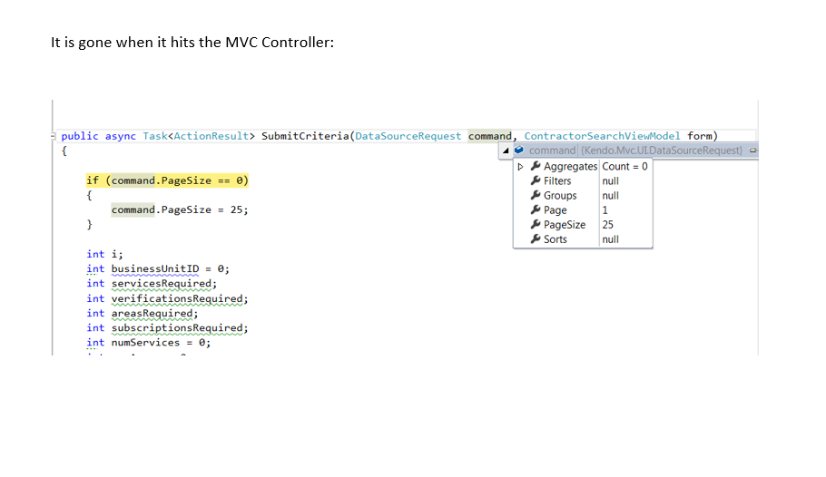 public async Task<ActionResult> SubmitCriteria([DataSourceRequest]DataSourceRequest command, ContractorSearchViewModel form)
