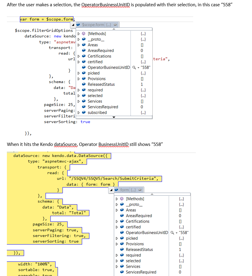 The problem is that is the values in $scope.form are set using ng-model on any inputs like <input type="text" ng-model="form.UnitID">, although it shows a value in $scope.form.UnitID in the Angular controller, when it reaches the MVC controller it is null. However, if instead of setting it from ng-model in an input, I set it manually in the Angular controller like $scope.form.UnitID = "123", then when the dataSource hits the MVC Controller, UnitID has value and is not null. I can I fix this? I need all of the information in the DataSourceRequest object as well as all of the information in the $scope.form object to get to my MVC Controller.