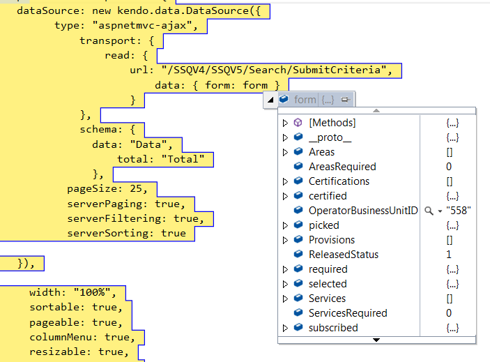 When this hits the MVC controller, "form" is completely populated as desired, but e.data is missing the "filtering" and "sorting" which are null. It only contains page and pageSize. This has been a very frustrating process. Any assistance is greatly appreciated!