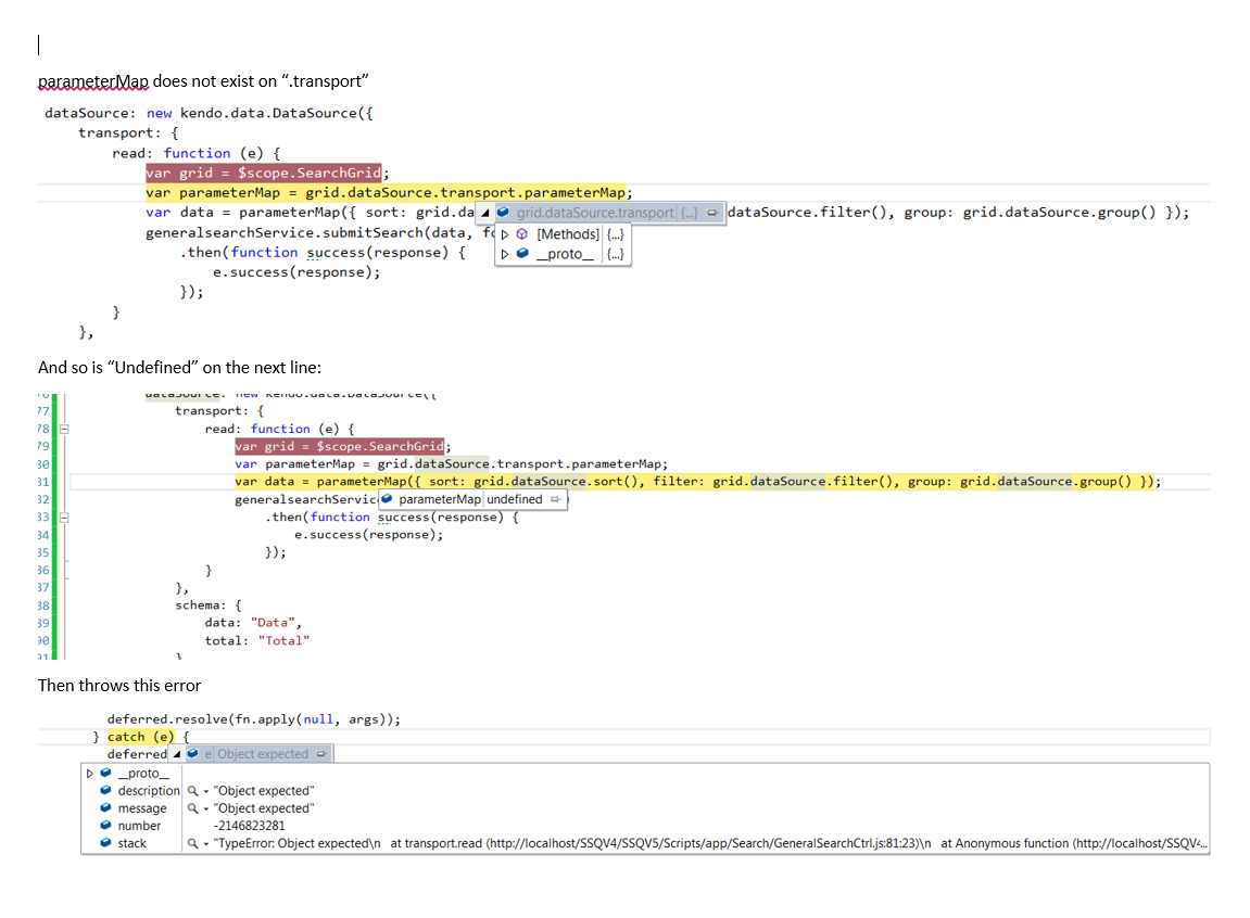 transport: { read: function (e) { generalsearchService.submitSearch(e.data, form) .then(function success(response) { e.success(response.data); }); } },but use the parameterMap function of your transport to serialize the data source information. Eventually the code will look like: