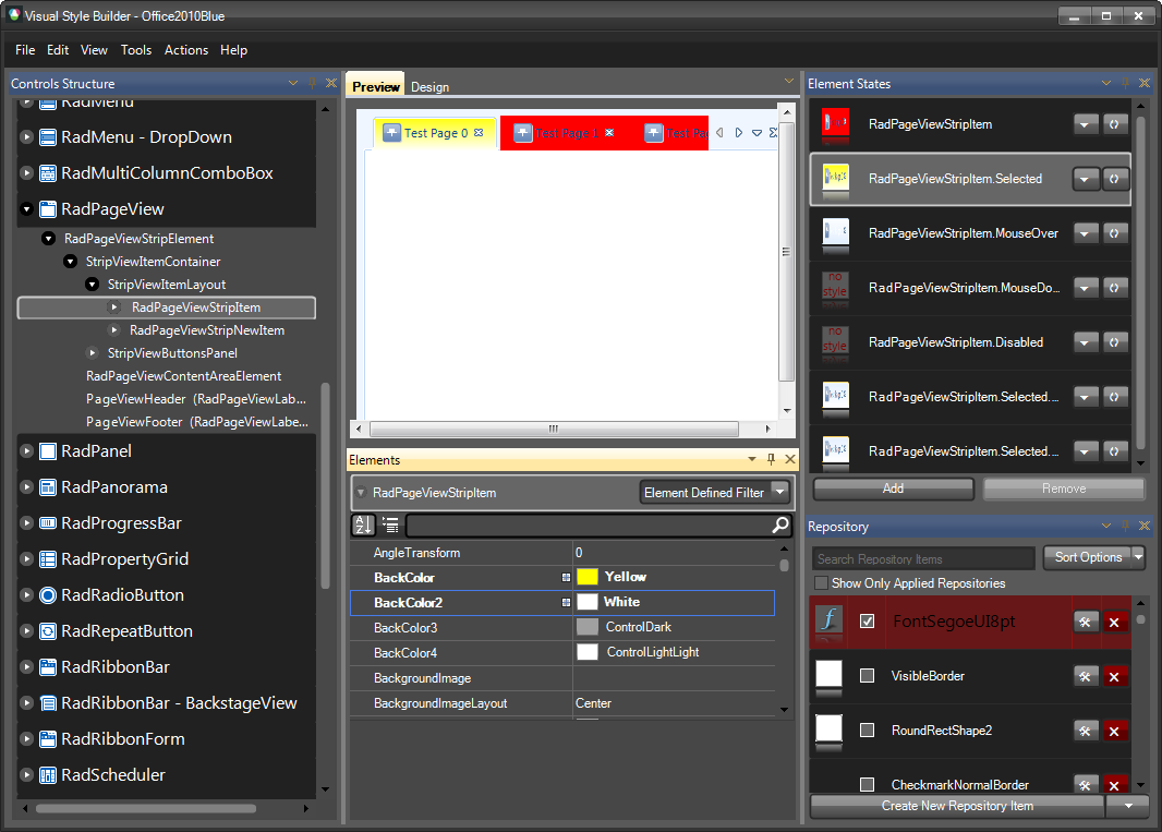 Select Case TypeName(e.RowElement) Case "GridTableHeaderRowElement", "GridGroupHeaderRowElement" e.RowElement.DrawFill = True e.RowElement.BackColor = Color.White e.RowElement.NumberOfColors = 1 e.RowElement.ForeColor = Color.DimGray Case "GridFilterRowElement", "GridNewRowElement" e.RowElement.DrawFill = True e.RowElement.BackColor = Color.LightGray e.RowElement.NumberOfColors = 1 e.RowElement.ForeColor = Color.DimGray Case "GridSummaryRowElement" e.RowElement.DrawFill = True e.RowElement.BackColor = Color.Gray e.RowElement.NumberOfColors = 1 e.RowElement.ForeColor = Color.DarkGray Case Else e.RowElement.ResetValue(LightVisualElement.DrawFillProperty, ValueResetFlags.Local) e.RowElement.ResetValue(LightVisualElement.BackColorProperty, ValueResetFlags.Local) e.RowElement.ResetValue(LightVisualElement.NumberOfColorsProperty, ValueResetFlags.Local) e.RowElement.ResetValue(LightVisualElement.ForeColorProperty, ValueResetFlags.Local) End SelectRadTabStrip has been obsolete for more than a year and it is not a part of our suite anymore, so I suppose that you are targeting our RadPageView. In the screenshot that you have posted I can clearly see that the top corners of the tab are rounded. Could you please specify which corners you need rounded and with what radius of the curve? This will allow me to understand your exact requirement and assist you further.