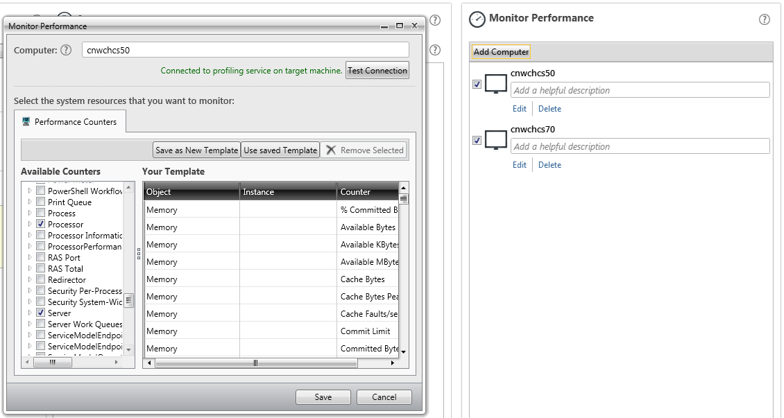 I've confirmed that the profiling service is up and running on one of the monitored machines and I have selected several counters and saved them (profiler,png).