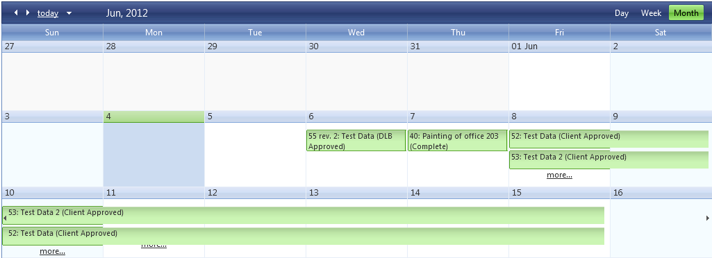 <%@ Page Title="" Language="vb" AutoEventWireup="false" MasterPageFile="~/Client/ClientPortal.master" CodeBehind="Summary.aspx.vb" Inherits="WorkNotifications.ClientSummary" %> <asp:Content ID="Content1" ContentPlaceHolderID="HeaderTopPlaceholder" runat="server"> <style type="text/css">a.HyperLink1{color:#57A6DC !important; font-style:italic;}</style> </asp:Content> <asp:Content ID="Content2" ContentPlaceHolderID="MainPlaceholder" runat="server"> There are currently <ul> <li id="btPending"><asp:Label ID="lblPending" runat="server" Text="# Pending Work Notifications"></asp:Label></li> <li id="btApproved"><asp:Label ID="lblApproved" runat="server" Text="# Approved Work Notifications"></asp:Label></li> <li id="btCompleted"><asp:Label ID="lblCompleted" runat="server" Text="# Completed Work Notifications"></asp:Label></li> </ul> <telerik:RadScheduler TimelineView-UserSelectable="False" runat="server" ID="RadScheduler1" TimeZoneOffset="00:00:00" SelectedView="MonthView" OverflowBehavior="Expand" DataSourceID="sqlSummary" DataKeyField="WN_ID" DataStartField="StartDate" DataEndField="EndDate" DataSubjectField="SubjectField" DayStartTime="8:00:00" DayEndTime="17:00:00" AllowDelete="false" AllowEdit="false" AllowInsert="False" Skin="Web20" DataDescriptionField="WN_Status"> <AdvancedForm Modal="true" /> <Reminders Enabled="true" /> <TimeSlotContextMenuSettings EnableDefault="true" /> <AppointmentContextMenuSettings EnableDefault="true" /> </telerik:RadScheduler> <asp:SqlDataSource ID="sqlSummary" runat="server" ConnectionString="<%$ ConnectionStrings:WorkNotificationConnectionString %>" SelectCommand="SELECT WN_ID, WN_Status, CONVERT(varchar, dbo.WorkNotifications.DisplayID) + CASE iteration WHEN 0 THEN '' ELSE ' rev. ' + CONVERT(varchar, Iteration) END + ': ' + dbo.WorkNotifications.Description + ' (' + dbo.WN_Status.WNS_Status + ')' AS SubjectField, ApproveByDateTime as StartDate, dateadd(day, 1, ApproveByDateTime) as EndDate FROM dbo.WorkNotifications LEFT OUTER JOIN dbo.WN_Status ON dbo.WorkNotifications.WN_Status = dbo.WN_Status.WNS_ID WHERE (DLBClientID = '2') AND (WN_Status = 3) AND (ArchivedForRevision = 0) UNION SELECT WN_ID, WN_Status, CONVERT(varchar, dbo.WorkNotifications.DisplayID) + CASE iteration WHEN 0 THEN '' ELSE ' rev. ' + CONVERT(varchar, Iteration) END + ': ' + dbo.WorkNotifications.Description + ' (' + dbo.WN_Status.WNS_Status + ')' AS SubjectField, WorkStartDate as StartDate, dateadd(day, 1, WorkEndDate) as EndDate FROM dbo.WorkNotifications LEFT OUTER JOIN dbo.WN_Status ON dbo.WorkNotifications.WN_Status = dbo.WN_Status.WNS_ID WHERE (DLBClientID = '2') AND (WN_Status = 5) AND (ArchivedForRevision = 0) UNION SELECT WN_ID, WN_Status, CONVERT(varchar, dbo.WorkNotifications.DisplayID) + CASE iteration WHEN 0 THEN '' ELSE ' rev. ' + CONVERT(varchar, Iteration) END + ': ' + dbo.WorkNotifications.Description + ' (' + dbo.WN_Status.WNS_Status + ')' AS SubjectField, DATEADD(dd, DATEDIFF(dd, 0, CompletedDate), 0) as StartDate, dateadd(day, 1, DATEADD(dd, DATEDIFF(dd, 0, CompletedDate), 0)) as EndDate FROM dbo.WorkNotifications LEFT OUTER JOIN dbo.WN_Status ON dbo.WorkNotifications.WN_Status = dbo.WN_Status.WNS_ID WHERE (DLBClientID = '2') AND (WN_Status = 6) AND (ArchivedForRevision = 0)"> </asp:SqlDataSource> </asp:Content>Imports System.Data.SqlClient Imports System.Drawing Public Class ClientSummary Inherits System.Web.UI.Page Private Sub ClientSummary_Load(sender As Object, e As System.EventArgs) Handles Me.Load Session("UserType") = "Client" Using connection As SqlConnection = New SqlConnection(System.Configuration.ConfigurationManager.ConnectionStrings("WorkNotificationConnectionString").ConnectionString) Dim cmd As New SqlCommand() cmd.Connection = connection cmd.Connection.Open() cmd.CommandText = "SELECT COUNT(dbo.WorkNotifications.WN_ID) AS Total, dbo.WN_Status.WNS_ClientMode " _ & "FROM dbo.WorkNotifications LEFT OUTER JOIN " _ & "dbo.WN_Status ON dbo.WorkNotifications.WN_Status = dbo.WN_Status.WNS_ID " _ & "WHERE (dbo.WorkNotifications.ArchivedForRevision = 0) AND (dbo.WorkNotifications.DLBClientID = '2') " _ & "GROUP BY dbo.WN_Status.WNS_ClientMode" Dim dr As SqlDataReader = cmd.ExecuteReader While dr.Read Select Case dr.Item("WNS_ClientMode") Case "Pending" If dr.Item("Total") = 1 Then lblPending.Text = "1 Pending Work Notification" Else lblPending.Text = dr.Item("Total") & " Pending Work Notifications" End If Case "Approved" If dr.Item("Total") = 1 Then lblApproved.Text = "1 Approved Work Notification" Else lblApproved.Text = dr.Item("Total") & " Approved Work Notifications" End If Case "Completed" If dr.Item("Total") = 1 Then lblCompleted.Text = "1 Completed Work Notification" Else lblCompleted.Text = dr.Item("Total") & " Completed Work Notifications" End If End Select End While dr.Close() End Using End Sub Private Sub RadScheduler1_AppointmentClick(sender As Object, e As Telerik.Web.UI.SchedulerEventArgs) Handles RadScheduler1.AppointmentClick Response.Redirect("../WN.aspx?WN_ID=" & e.Appointment.ID.ToString) End Sub Private Sub RadScheduler1_AppointmentDataBound(sender As Object, e As Telerik.Web.UI.SchedulerEventArgs) Handles RadScheduler1.AppointmentDataBound If e.Appointment.Description <> Nothing Then Select Case e.Appointment.Description.ToString Case 3 'Unapproved e.Appointment.BackColor = Color.Gold e.Appointment.BorderColor = Color.DarkGoldenrod Select Case e.Appointment.Description.ToString Case 3 e.Appointment.CssClass = "AppBackGround" End Select Exit Select Case 5 'DLB & Client Approved e.Appointment.BackColor = Color.PaleGreen e.Appointment.BorderColor = Color.DarkGreen Exit Select Case 6 'Completed e.Appointment.BackColor = Color.Gainsboro e.Appointment.ForeColor = Color.DimGray e.Appointment.BorderColor = Color.DarkGray Exit Select Case Else Exit Select End Select End If End SubEnd Class
