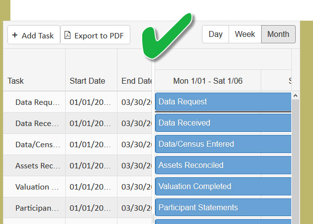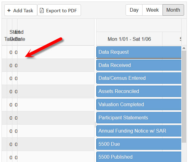<telerik:RadGantt RenderMode="Auto" runat="server" ID="RadGanttTasks" DataSourceID="SqlDataSource1" DependenciesDataSourceID="SqlDataSource2" Height="800px" SelectedView="MonthView" AutoGenerateColumns="false" AllowColumnResize="true" DisplayDeleteConfirmation="true" EnablePdfExport="true" SnapToGrid="true" Width="600px" ListWidth="300px" > <Localization /> <YearView SlotWidth="250px" /> <MonthView SlotWidth="250px" /> <WeekView SlotWidth="250px" /> <DayView SlotWidth="250px" /> <Columns> <telerik:GanttBoundColumn UniqueName="Subject" DataField="Title" AllowEdit="true" Width="125px" AllowSorting="false" HeaderText="Task" DataType="String" /> <telerik:GanttBoundColumn UniqueName="StartDate" DataField="Start" AllowEdit="true" Width="105px" AllowSorting="false" HeaderText="Start Date" DataType="DateTime" DataFormatString="MM/dd/yyyy hh:mm tt" /> <telerik:GanttBoundColumn UniqueName="EndDate" DataField="End" AllowEdit="true" Width="105px" AllowSorting="false" HeaderText="End Date" DataType="DateTime" DataFormatString="MM/dd/yyyy hh:mm tt" /> </Columns> <DataBindings> <TasksDataBindings IdField="TaskProjectDetailTemplateId" ParentIdField="TaskProjectDetailTemplateIdParent" StartField="Start" EndField="End" OrderIdField="TaskLevel" ExpandedField="Expanded" PercentCompleteField="PercentComplete" TitleField="Title" SummaryField="Summary" /> <DependenciesDataBindings TypeField="Type" IdField="TaskProjectDetailTemplateDependId" PredecessorIdField="PredecessorID" SuccessorIdField="SuccessorID" /> </DataBindings> </telerik:RadGantt>