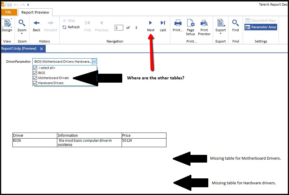 Indeed the other tables are also on the report but you need to click on Next to go to the next page. Check the attached screenshot. You can see that there are three pages for each table.