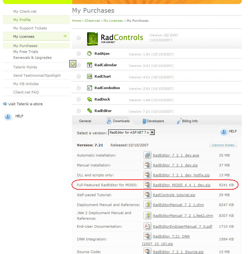 You need to get the RadEditor_MOSS_4_5_2_dev.zip file (it is circled in red in the screenshot). The file becomes visible after you click the "all individual controls" link bellow the RadControls pane, then click the RadEditor pane and finally click the downloads tab.