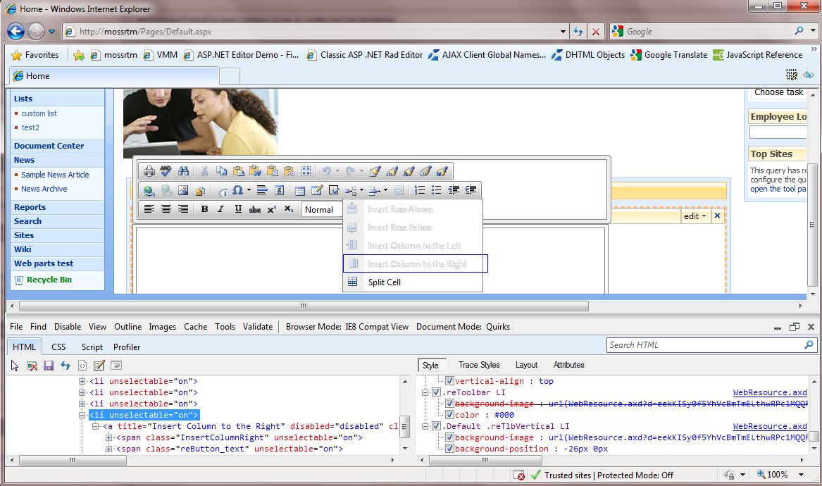 What I suggest you to do is check if upgrading to the latest version of RadEditor for MOSS, which now is 5.6.2 will solve the issue. You can find the upgrade instructions in the following online help article MOSS http://www.telerik.com/help/aspnet-ajax/upgrade_to_a_newer_version_of_radeditor_for_moss.html