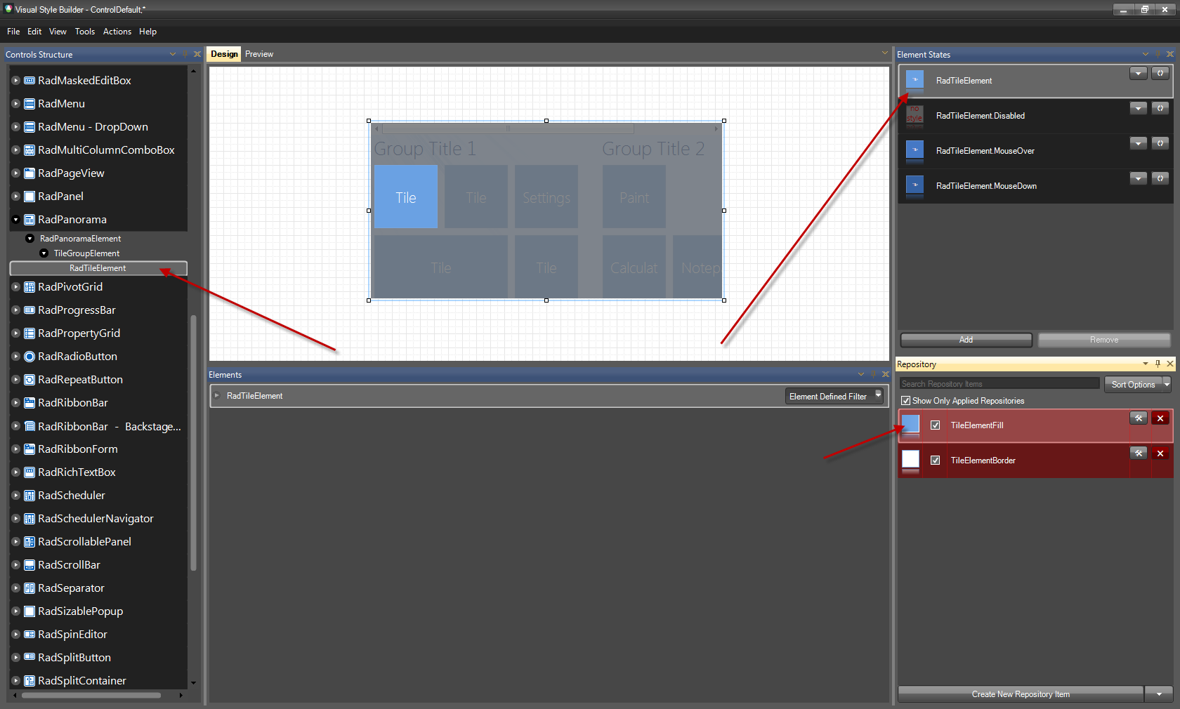 void Form1_MouseLeave(object sender, EventArgs e){ RadTileElement el = (RadTileElement)sender; el.BackColor = Color.Red;}void Form1_MouseEnter(object sender, EventArgs e){ RadTileElement el = (RadTileElement)sender; el.BackColor = Color.Yellow;}I hope this helps.