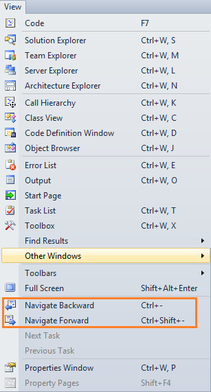 The navigation you are probably refering to is "Navigate Backward" (alternatively "Navigate Forward") available in Visual Studio. You can find it in the View menu. I've attached a screenshot showing where those items are situated. The keyboard shortcuts are also visible there. If you want to customize those and change them to something else, you can do that by going to Tool | Options | Environment | Keyboard.