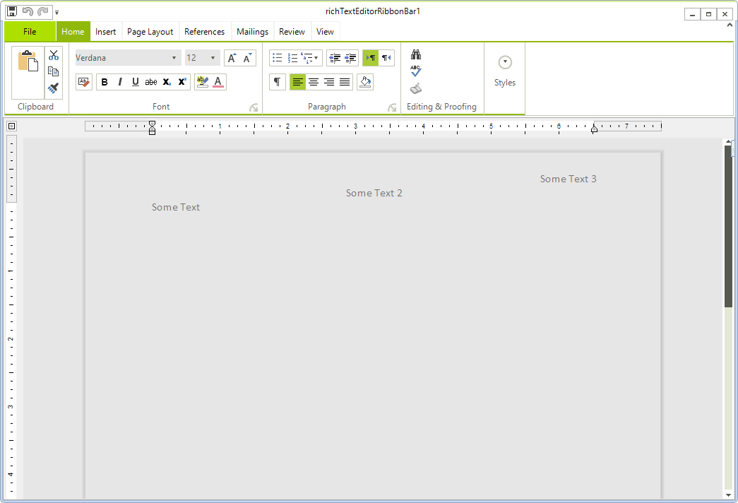 private void radButton1_Click(object sender, EventArgs e){ TextBlock textBlock = new TextBlock() { Text = "Some Text", FontSize = 16, FontFamily = new Telerik.WinControls.RichTextEditor.UI.FontFamily("Calibri"), PositionOffset = new System.Drawing.SizeF(0, 20) }; FloatingUIContainer uiContainer = new FloatingUIContainer(textBlock, new Telerik.WinControls.RichTextEditor.UI.Size(75, 25)); TextBlock textBlock2 = new TextBlock() { Text = "Some Text 2", FontSize = 16, FontFamily = new Telerik.WinControls.RichTextEditor.UI.FontFamily("Calibri"), PositionOffset = new System.Drawing.SizeF(200, 0) }; FloatingUIContainer uiContainer2 = new FloatingUIContainer(textBlock2, new Telerik.WinControls.RichTextEditor.UI.Size(75, 25)); TextBlock textBlock3 = new TextBlock() { Text = "Some Text 3", FontSize = 16, FontFamily = new Telerik.WinControls.RichTextEditor.UI.FontFamily("Calibri"), PositionOffset = new System.Drawing.SizeF(400, -20) }; FloatingUIContainer uiContainer3 = new FloatingUIContainer(textBlock3, new Telerik.WinControls.RichTextEditor.UI.Size(75, 25)); Paragraph paragraph = new Paragraph(); paragraph.Inlines.Add(uiContainer); paragraph.Inlines.Add(uiContainer2); paragraph.Inlines.Add(uiContainer3); Section section = new Section(); section.Blocks.Add(paragraph); RadDocument commentBody = new RadDocument(); commentBody.Sections.Add(section); Header header = new Header() { Body = commentBody, IsLinkedToPrevious = false }; this.radRichTextEditor1.UpdateHeader(this.radRichTextEditor1.Document.Sections.First, HeaderFooterType.Default, header);}Please note that this header only consists of UI elements and these elements will not be persisted in the document if it later exported, e.g. to Word.