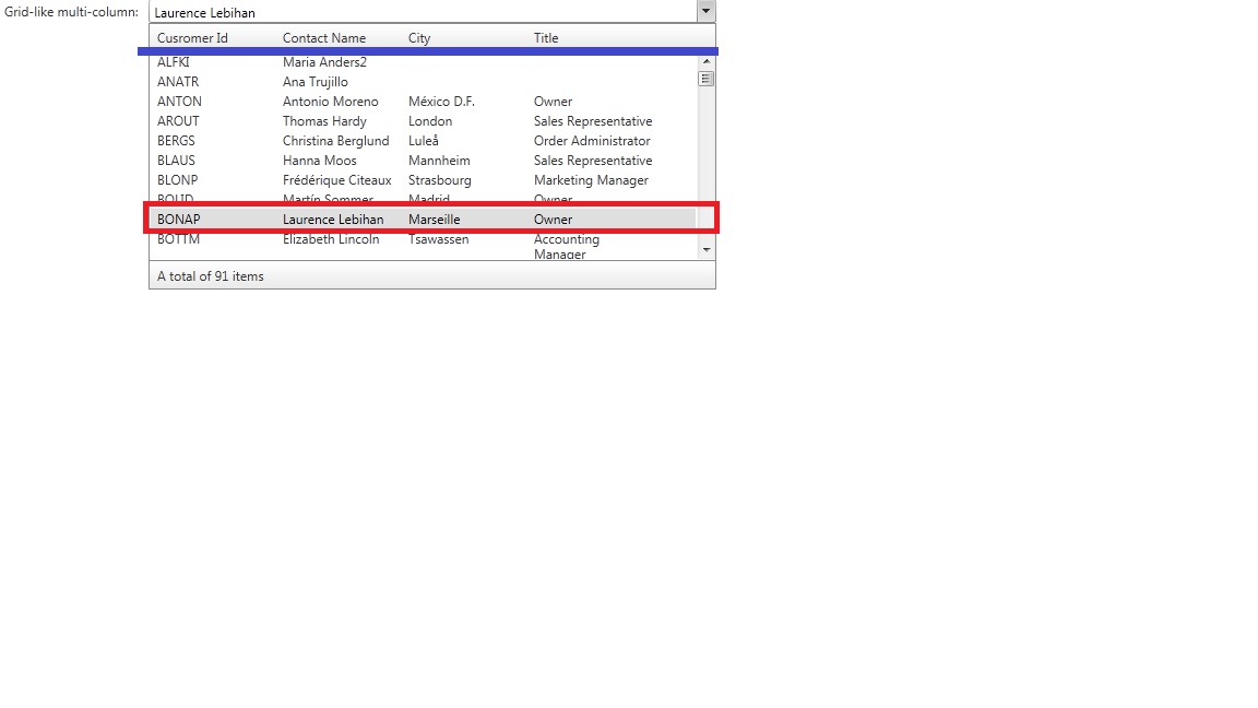 My question is: How to hide an item alongwith it's other attribute columns from that Multi Column RadCombo Box and Put that item along with its attributes always on top of the list. Example: I would like the Item with Customer id BONAP will always be the 1st Item (i.e. apprear before Customer Id: ALFKI). Attached is my desired result.