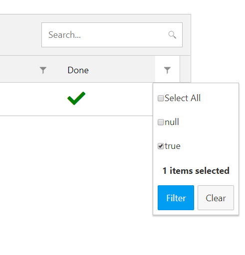 { field: "Done", title: "Done", template: function (dataItem) { var done = "" if (dataItem.Done) { done = '<i class="fas fa-check fa-2x" style="color: green !important;"></i>' } return done; }, filterable: { multi: true }}