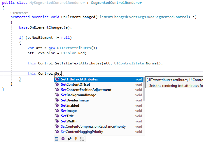 using Windows.UI.Xaml;using Segmented_CustomRenderers.UWP.CustomRenderers;using Telerik.XamarinForms.Input;using Telerik.XamarinForms.InputRenderer.UWP;using Xamarin.Forms.Platform.UWP;[assembly: ExportRenderer(typeof(RadSegmentedControl), typeof(MySegmentedControlRenderer))]namespace Segmented_CustomRenderers.UWP.CustomRenderers{ public class MySegmentedControlRenderer : SegmentedControlRenderer { protected override void OnElementChanged(ElementChangedEventArgs<RadSegmentedControl> e) { base.OnElementChanged(e); if (e.NewElement != null) { this.Control.ItemTemplate = Application.Current.Resources["CustomSegmentItemTemplate"] as DataTemplate; } } }}Here's the result at runtime