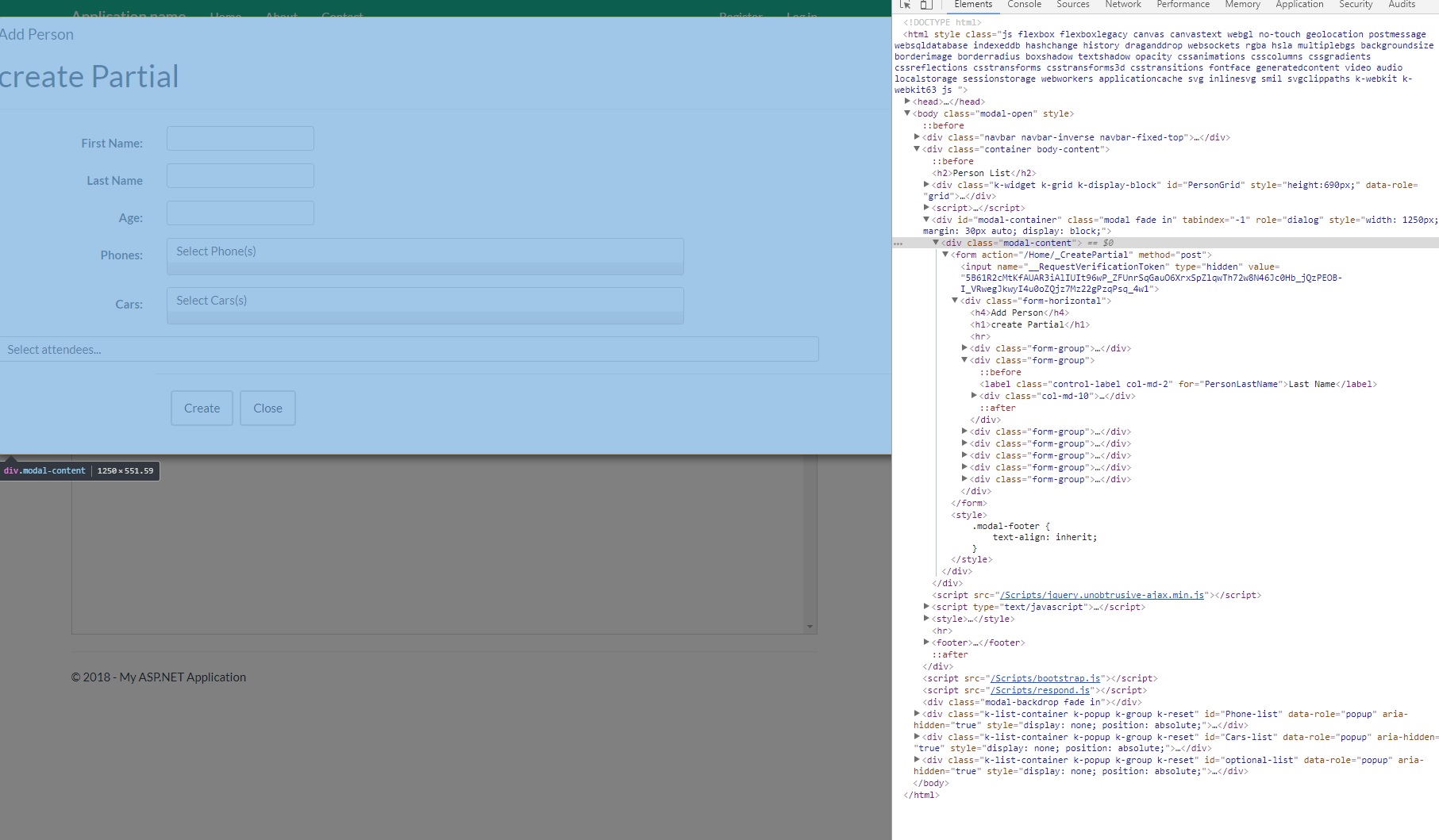 Hey there guys and girl, i seem to be having a bit of an issues with the KENDO multi-select list when using it in a bootstrap modal. I have a simple form (_CreatePartial) that is used to add a new person to the. When the form is opened the first time, the multi-select list (car and phone ) load and appear properly but if you close the modal and re-open it, the multi-select lists don't load again.I don't know what exactly could be causing this, I am using the latest version of KENDO (2018.1.117) and latest version of bootstrap-3 (3.3.7). I have attached pictures to show what i see. Thanks for the help