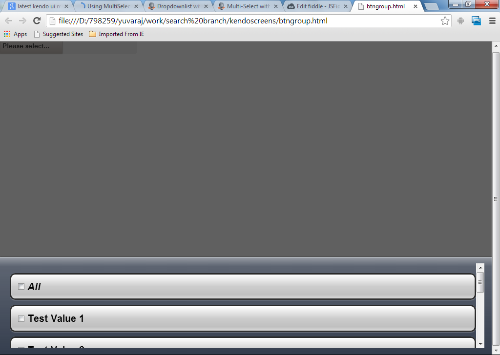 <div id="ViewModelModel" class='dealer-filter'> <select id="oemFilterItems" multiple="multiple" data-role="multiselectbox" data-option-label="OEM..." data-text-field="Name" data-value-field="ID" data-bind="source: oemFilterItemSource, value: oemFilterItems" /> <select id="networkFilterItems" multiple="multiple" data-role="multiselectbox" data-option-label="Network..." data-text-field="Text" data-value-field="Value" data-bind="source: networkFilterItemSource, value: networkFilterItems" /></div>01.<script>02. var viewModel = kendo.observable({03. networkFilterItems: [],04. networkFilterItemSource: new kendo.data.DataSource({05. data: [06. { Value: 1, Text: "Facebook" },07. { Value: 2, Text: "Twitter" },08. { Value: 3, Text: "Google" },09. { Value: 4, Text: "Blooger" }10. ]11. }),12. oemFilterItems: [],13. oemFilterItemSource: new kendo.data.DataSource({14. transport: { read: { url: "/Reputation/Reputation/OEMListFiltered", dataType: "json" } },15. schema: { data: "Data" }16. })17. });18. 19. $(function () {20. 21. kendo.bind($("#ViewModelModel"), viewModel);22. });23.</script>I really like this implementation, it best represents the functionality I've been looking for with built-in Select All functionality and a count of selected items. Implemented as-is I've experienced a couple of issues and I wondered if you could provide any insight into these. First in the latest version of kendo (all) I get the following error: Uncaught TypeError: Object [object Object] has no method '_valueOnFetch'. This seems to happen in the kendo framework itself where it interprets the nodes as numbers and not as li items. The second error, which doesn't throw any kind of exception is that after selecting all/deselect all the checkboxes no longer show checked. The values are selected correctly, but it appears a toggle count may be off by 1. The one difference between my implementation and your JSFiddle example is that my control is loaded dynamically via AJAX. I was wondering if you had encountered either of these issues or could offer some insight as to why they might be happening. Also if you have any recent enhancements I'd love to see them.