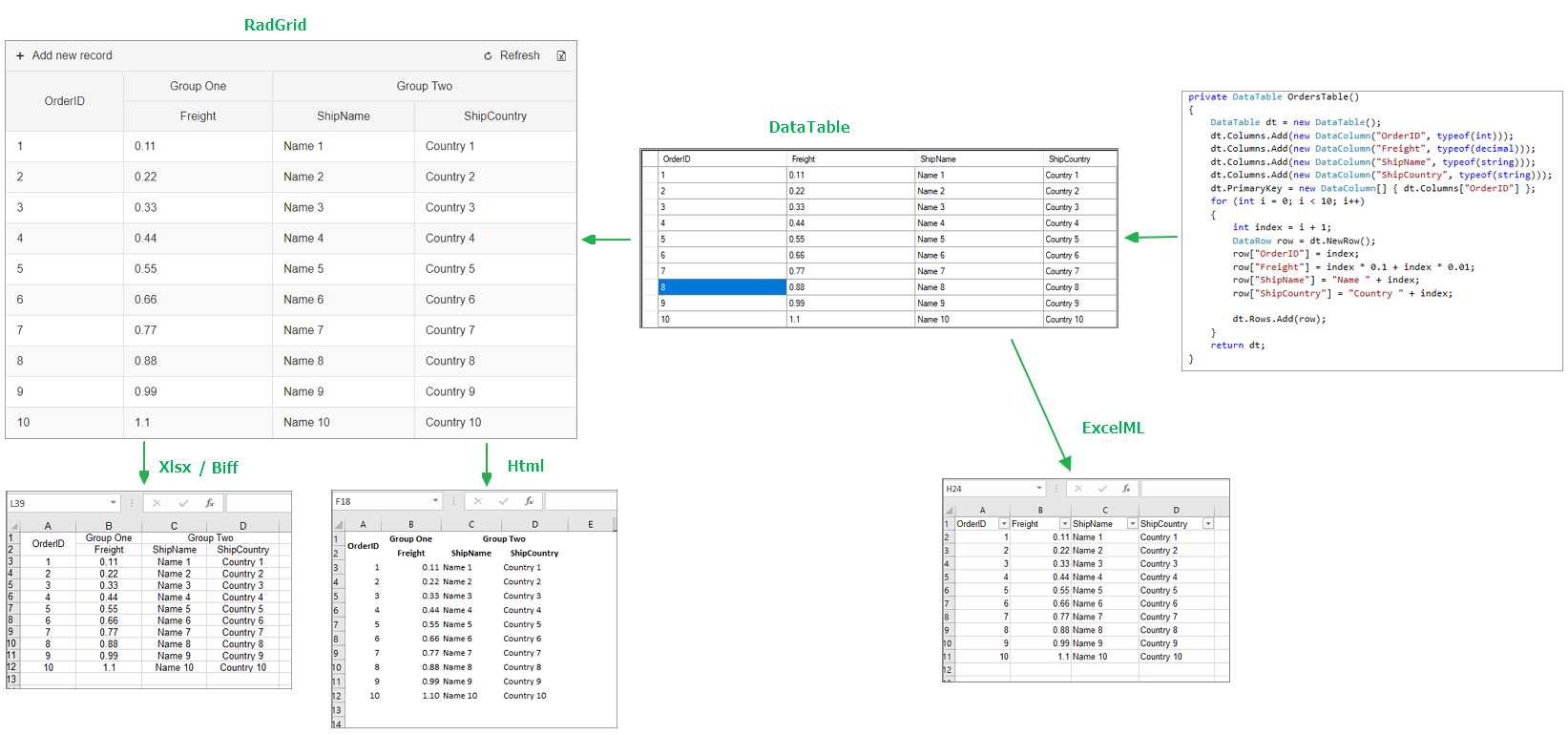 // XLSXprotected void RadButton1_Click(object sender, EventArgs e){ RadGrid1.ExportSettings.Excel.Format = GridExcelExportFormat.Xlsx; RadGrid1.ExportToExcel();}// HTMLprotected void RadButton2_Click(object sender, EventArgs e){ RadGrid1.ExportSettings.Excel.Format = GridExcelExportFormat.Html; // HTML is the default value RadGrid1.ExportToExcel();}// BIFFprotected void RadButton3_Click(object sender, EventArgs e){ RadGrid1.ExportSettings.Excel.Format = GridExcelExportFormat.Biff; RadGrid1.ExportToExcel();}protected void RadGrid1_NeedDataSource(object sender, GridNeedDataSourceEventArgs e){ RadGrid1.DataSource = OrdersTable(); }private DataTable OrdersTable(){ DataTable dt = new DataTable(); dt.Columns.Add(new DataColumn("OrderID", typeof(int))); dt.Columns.Add(new DataColumn("OrderDate", typeof(DateTime))); dt.Columns.Add(new DataColumn("Freight", typeof(decimal))); dt.Columns.Add(new DataColumn("ShipName", typeof(string))); dt.Columns.Add(new DataColumn("ShipCountry", typeof(string))); dt.PrimaryKey = new DataColumn[] { dt.Columns["OrderID"] }; for (int i = 0; i < 4; i++) { int index = i + 1; DataRow row = dt.NewRow(); row["OrderID"] = index; row["OrderDate"] = new DateTime(DateTime.Now.Year, DateTime.Now.Month, DateTime.Now.Day, 0, 0, 0).AddHours(index); row["Freight"] = index * 0.1 + index * 0.01; row["ShipName"] = "Name " + index; row["ShipCountry"] = "Country " + index; dt.Rows.Add(row); } return dt;}Kind regards,