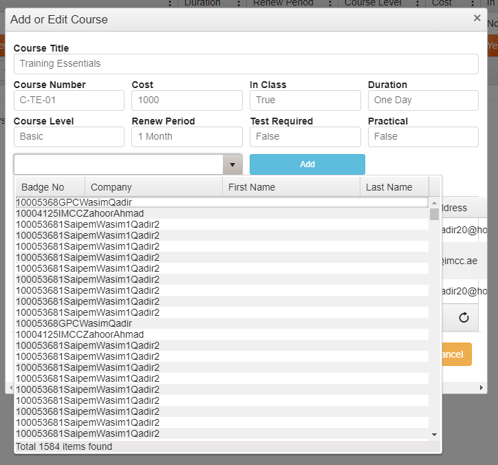<div class="col-md-6 col-sm-12" style="margin-top:10px"> @(Html.Kendo().MultiColumnComboBoxFor(model=>model.Trainers) .Name("trainersCombo") .DataTextField("emp_badge_no") .DataValueField("id") .Filter("contains") .FilterFields(new string[] { "emp_first_name", "emp_last_name", "emp_company" }) .Columns(columns => { columns.Add().Field("emp_badge_no").Title("Badge No").Width(100); columns.Add().Field("emp_company").Title("Company").Width(200); columns.Add().Field("emp_first_name").Title("First Name").Width(200); columns.Add().Field("emp_last_name").Title("Last Name").Width(100); }) .FooterTemplate("Total #: instance.dataSource.total() # items found") .HtmlAttributes(new { style = "width:100%;" }) .Height(400) .DataSource(source => source .Custom() .Transport(transport => transport .Read(read => { read.Action("GetAllEmployees", "CourseTrainer").Data("onAdditionalData"); })) ) )</div>and here is the code for GetAllEmployees