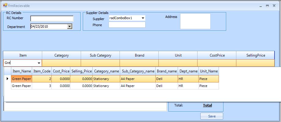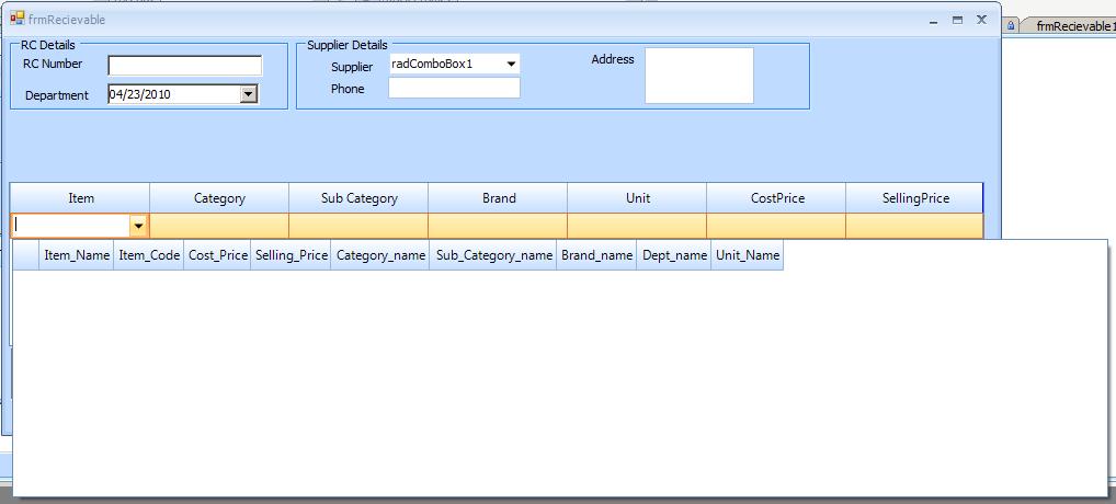 I have Code,Item,category columns in multicolumncombox..and Item and Category column in radgrid.