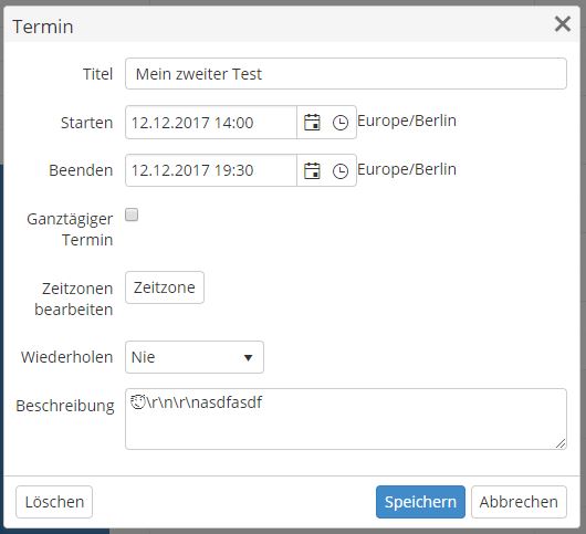 [{"id":"AAMkAGFlYmQ3ZDdmLWRlNmItNGY1YS04ZmI0LTI5MDgzNjYwYjQ5YQBGAAAAAAC9KrO2CxzZQImm0eyEhcXmBwC5xK3E1TNIRYKP5MAXBVCbAAAAAAENAAC5xK3E1TNIRYKP5MAXBVCbAAI/taVmAAA=","title":"Mein zweiter Test","description":"😌\\r\\n\\r\\nasdfasdf","start":"2017-12-12T14:00:00","startTimezone": "Europe/Berlin","end":"2017-12-12T19:30:00","isAllDay":false}]