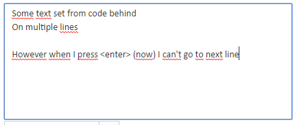 I've been facing issues with RadTextBox for ASP in MultiLine mode when pressing the enter key. Actually no new line is displayed. When I set the text from codebehind or using binding the text is correctly displayed on multiple lines. This is illustrated in the radtextbox.png file attached.