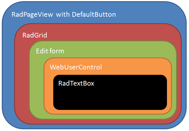 <telerik:RadTextBox ID="RadTextBox1" Text='<%# DataBinder.Eval(Container, "DataItem.MyField") %>' runat="server" TextMode="MultiLine" Rows="8" Columns="40" RenderMode="Lightweight"></telerik:RadTextBox>In the struct.png file attached you'll find the structure of my web page.