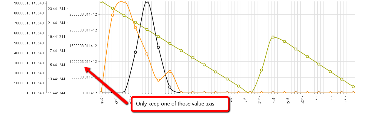 for (var i = 0; i < data.Data.length; i++) { chartOptions.valueAxis.push({ name: data.Data[i].name + '-' + i, min: data.Data[i].data.min(), max: data.Data[i].data.max(), title: { text: data.Data[i].name + '-' + i, visible: false }, visible: true }); } // Draw Series Axes for (var i = 0; i < data.Data.length; i++) { chartOptions.series.push({ axis: data.Data[i].name + '-' + i, data: data.Data[i].data, color: seriesOptions[i].color, highlight: { markers: { visible: true } }, name: data.Data[i].name + '-' + i, markers: { visible: true }, style: seriesOptions[i].style, type: seriesOptions[i].type, }); } // Draw Categories Axes chartOptions.categoryAxis.categories = []; for (var i = 0; i < data.Categories.length; i++) { chartOptions.categoryAxis.categories.push(data.Categories[i]); }Now what is happening is for each series that i add, one new value axis is added too. My question is: