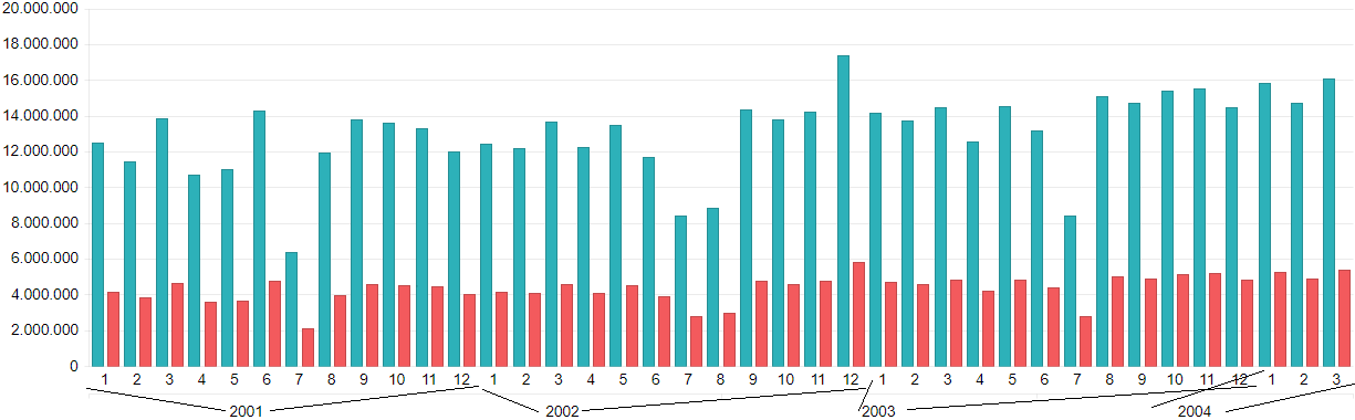 I would like to have two or more category axes, where in this example, I would like all the months for each year to be displayed above the year. Both year and month should use the same value series "YAxis".