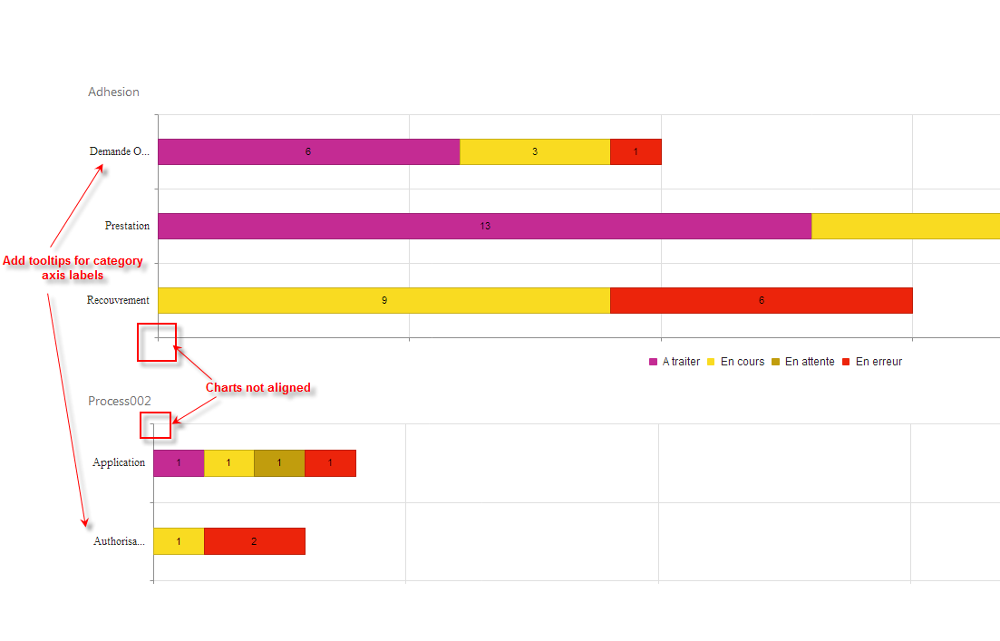 One workaround we've tried to implement is to truncate the category text. This almost works but the graphs are still slightly out of line; we also need to have a tooltip displayed when the users hover their cursor above the category axis labels.