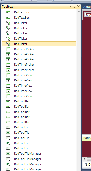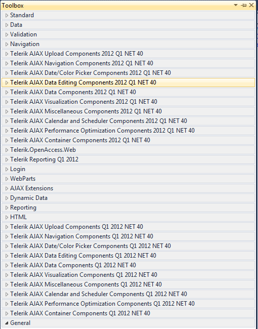 10) Load a solution that uses Telerik controls (in my case it was an asp.net website) and confirm that the toolbox only has one of each item in it.