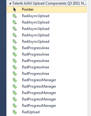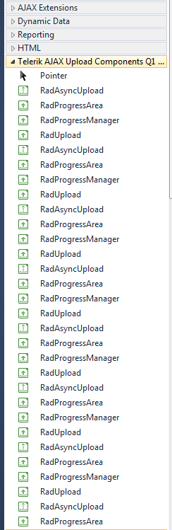 I tried resetting the toolbox, deleting the tbd files, deleting the tabs and regenerating the items using the "Toolbox Configurator" and manually choosing items; no matter what I do, the tab <RadControls for ASP.NET AJAX Q3 2010 NET40>, is always showing 3 items for NET20, NET35 and NET40 or NET40 items twice after resetting visual studio.