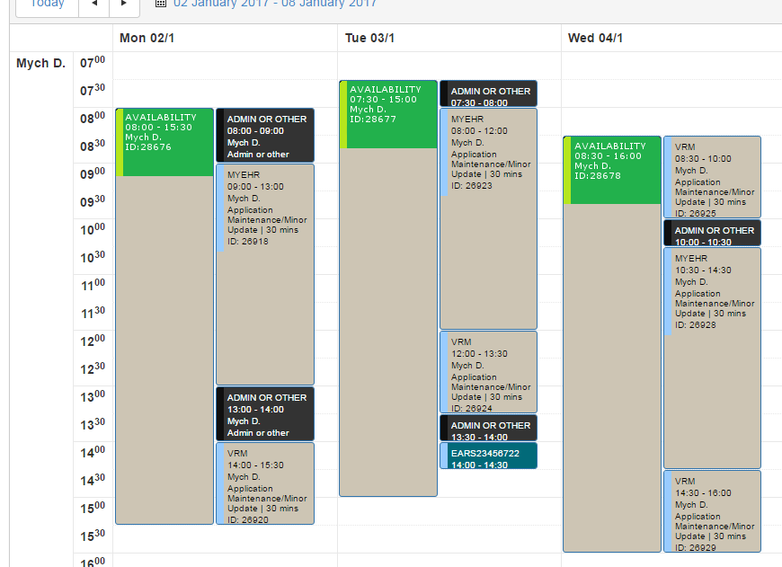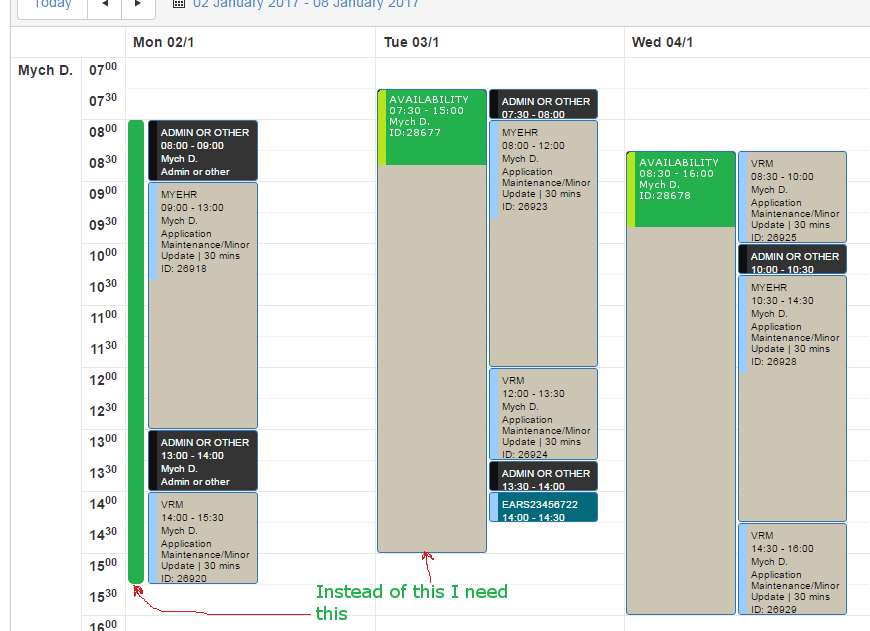 Tyler, many thanks for your swift reply.... unfortunately I didn't explain what I needed well enough. I've created another mock image attached which shows what I've been requested to achieve if possible. The thin green event is almost like a placeholder that is created as an event by the user so that their manager know when they are available for work assignments.