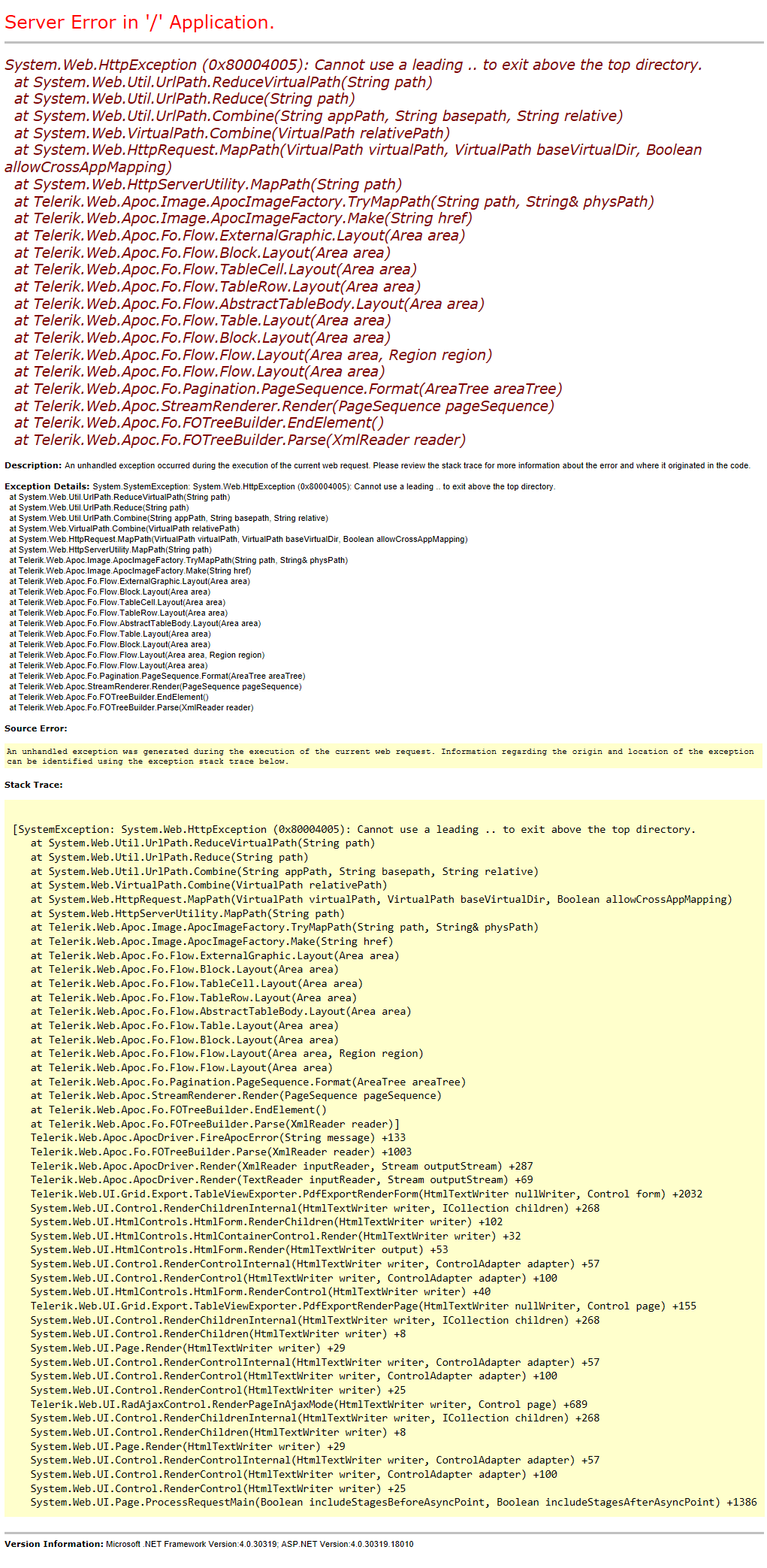 (2) When exporting to a PDF file, the PDF file never displays but I do receive a new window filled with .net errors. (see attached screen capture.