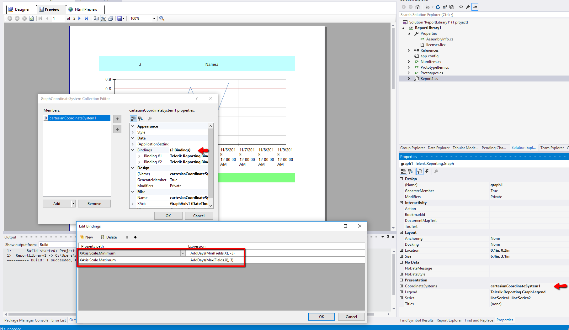 Ideally, it would be best to pass two line series, one for the raw X/Y data and a second for the alert level with just two data points: start date and end date as X values and the Y values as the alert level. I cannot determine if reporting supports this sort of operation. The main problem involves the DataSource binding for the Graph. How would one define classes to and set properties to make the Graph object "aware" of two (or more) line series?