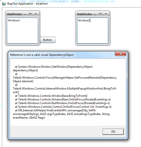 Hi, I'm having a problem with using the Rad Windows in a very specific way. I have a button that opens two RadWindows side by side. If the user is running the app OOB then clicking one of the windows always crashes the application. This is only in OOB and only with more than one window showing.