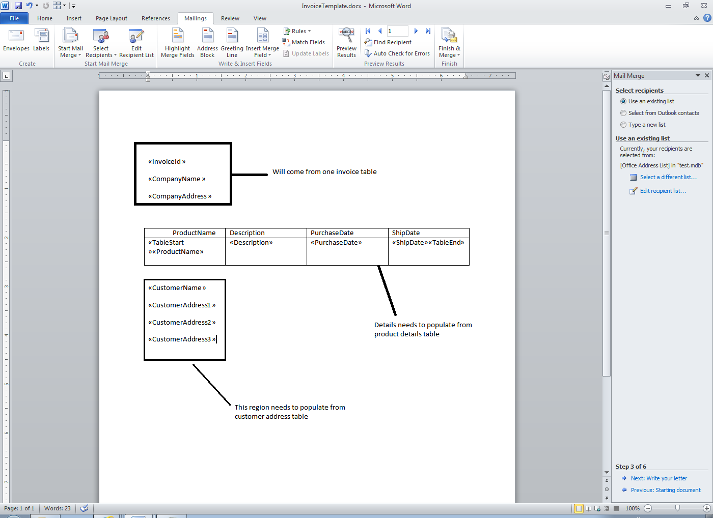 Is it possible to mail merge using multiple datasources, for example invoice word template having 3 region and each region needs to populate from respective table.