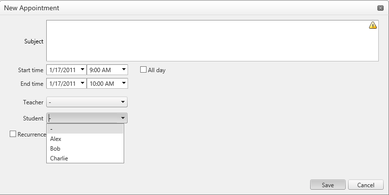 public override IEnumerable<Resource> GetResourcesByType(RadScheduler owner, string resourceType){ switch (resourceType) { case "Teacher": return Teachers.Values; case "Student": return Students.Values; default: throw new InvalidOperationException("Unknown resource type: " + resourceType); }}public override IDictionary<ResourceType, IEnumerable<Resource>> GetResources(ISchedulerInfo schedulerInfo){ var resCollection = new Dictionary<ResourceType, IEnumerable<Resource>>(); resCollection.Add(new ResourceType("Teacher", false), Teachers.Values); resCollection.Add(new ResourceType("Student", true), Students.Values); return resCollection;}public override IEnumerable<ResourceType> GetResourceTypes(RadScheduler owner){ var resourceTypes = new ResourceType[2]; resourceTypes[0] = new ResourceType("Teacher", false); resourceTypes[1] = new ResourceType("Student", true); return resourceTypes;}